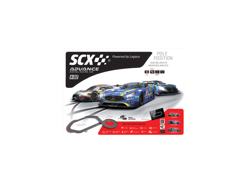 Elektrická závodní autodráha SCX Advance Pole Position 2.0 v klasickém měřítku 1:32 pro napínavější závody - vynikající digitální autodráha s možností předjížděním v křížení (ovladačem řízená výhybka), Bluetooth rovinkou pro počítání kol v aplikaci, mostem svodidly a krajnicí s mantinely. Balení obsahuje tři bezdrátové ovladače s přepínačem výhybky, tři detailně zpracovaná digitální dráhová autíčka SCX Mercedes AMG GT3 Bilstein, Audi R8 LMS GT3