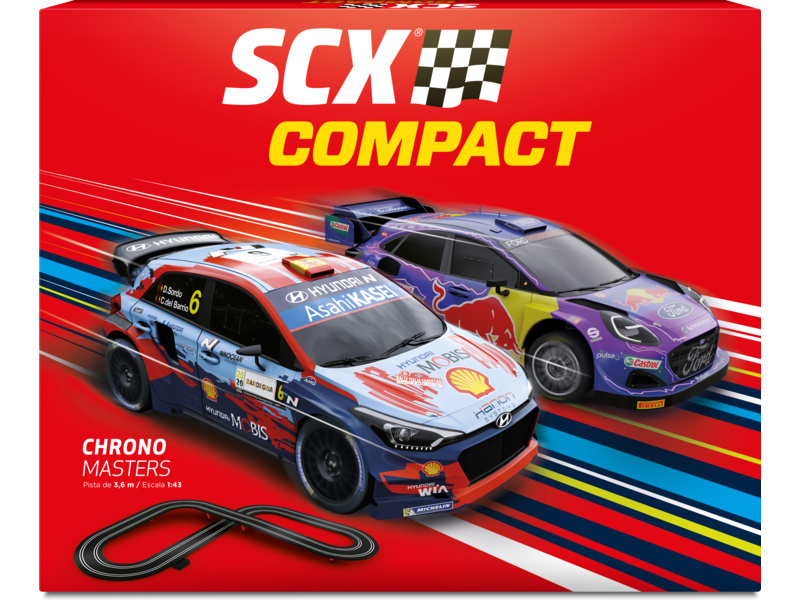 Autodráha SCX Compact Chrono Masters v měřítku 1:43 - analogová elektrická autodráha s rovinkami, zatáčkami a mostem. Dva bezdrátové ovladače, dvě detailní dráhová autíčka se světly, Ford Ford Puma Rally 1 WRC Montecarlo a Hyundai Hyundai i-20 WRC. Plocha pro rozložení základní varianty: 114 x 114 cm. Délka tratě: 3,6 m. Složení tratě je velmi snadné, jednotlivé traťové díly zacvaknete do sebe, připojíte ovladače a můžete začít závodit.