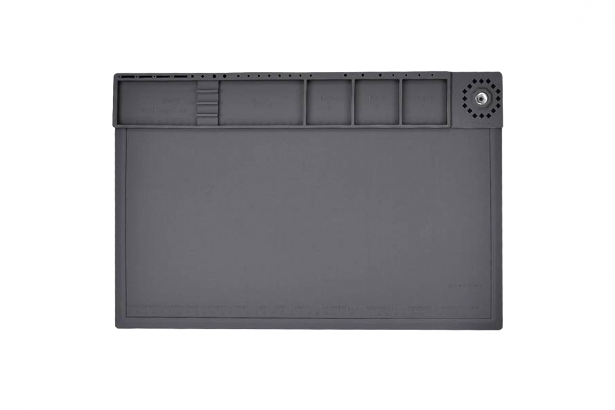 Šedá silikonová opravárenská podložka s magnetickou zónou o rozměrech 45 × 30 cm. Vyrobena ze silikonu a integrovaných magnetů, tloušťka 5 mm, hmotnost 560 g. Odolná vůči vysokým teplotám, antistatická a s magnetickými oblastmi pro uchycení šroubků a drobných kovových dílů. Ideální pro servisní práce na elektronice, jako jsou opravy telefonů, notebooků či jiných citlivých zařízení.