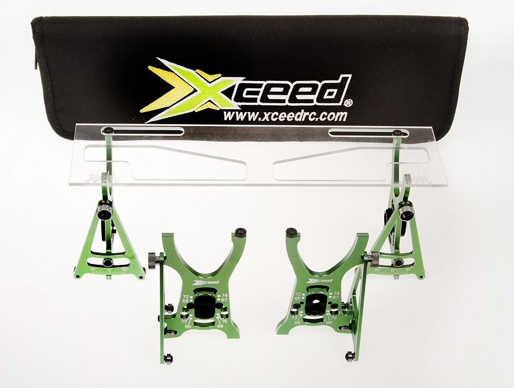 Systém nastavení pro RC aut v měřítku 1/10. Zahrnuje - Přesně opracované hliníkové držáky ve studené zelené eloxaci - Vroubkované matice pro snadnou a rychlou montáž kol - Vysoce kvalitní spojovací prvky - Obráběné nylonové výstředníky pro průměr pneumatiky - Plně uložené v kuličkových ložiskách - Přesné gravírování a značení - Polykarbonátová horní deska - Praktický úložný vak