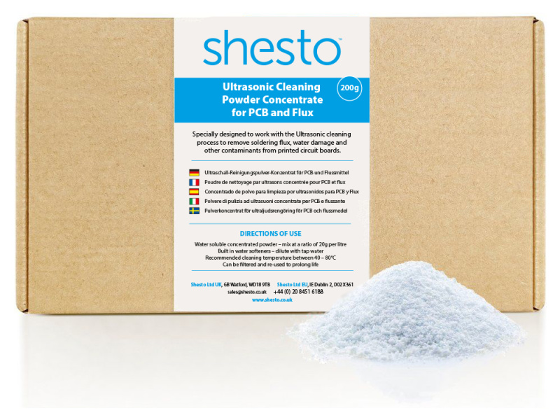 Speciálně navržený koncentrovaný prášek rozpustný ve vodě, pro ultrazvukové čištění k odstranění pájecího tavidla, oxidace a dalších nečistot z desek plošných spojů. Vytvoření až 10 l roztoku z 200 g koncentrátu. Pro prodloužení životnosti lze roztok filtrovat a znovu použít. Práškový koncentrát se oproti klasickým roztokům snáze skladuje.