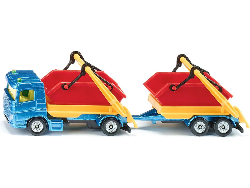 Kovový model nákladního auta s přívěsem a kontejnery, délka přibližně 15 cm, měřítko 1:87. Model obsahuje čirá okna, majáčky, odpojitelný dvounápravový přívěs, sklopná ramena a dva červené kontejnery. Vhodné pro hraní i sběratelství. Kvalitní zpracování z kovu a plastu. Baleno v blistru.