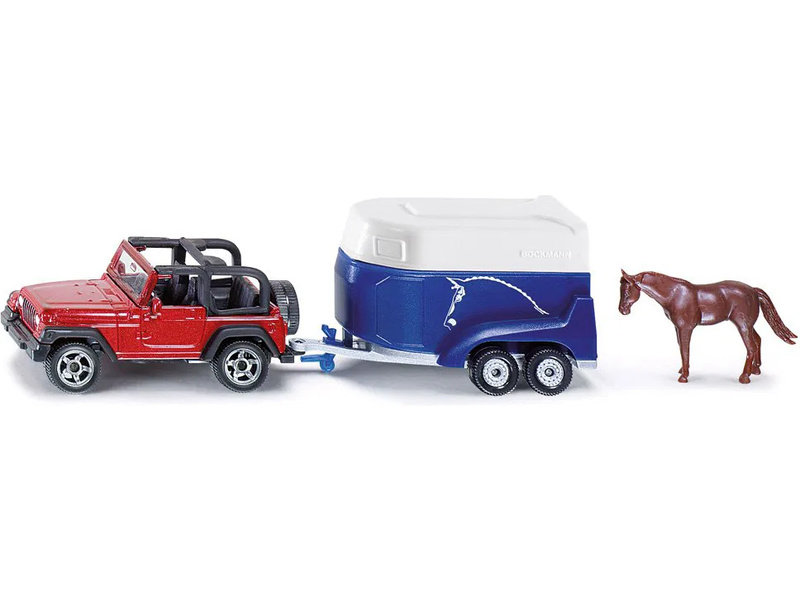 Kovový model terénního vozu Jeep Wrangler s přívěsem a koněm od značky Siku, délka přibližně 15 cm, měřítko 1:87. Model má zpracovaný interiér, dvounápravový krytý přívěs je odpojitelný, má otevírací zadní čelo. Figurka koně je obsahem balení. Vhodné pro hraní i sběratelství. Kvalitní zpracování z kovu a plastu. Baleno v blistru.