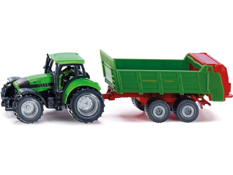 Kovový model traktoru DEUTZ-FAHR s rozmetadlem hnoje Strautmann, délka přibližně 17 cm, měřítko 1:87. Odpojitelná dvounápravová vlečka má vzadu výklopné rozmetadlo s otevíracím zadním čelem. Vhodné pro hraní i sběratelství. Kvalitní zpracování z kovu a plastu. Baleno v blistru.