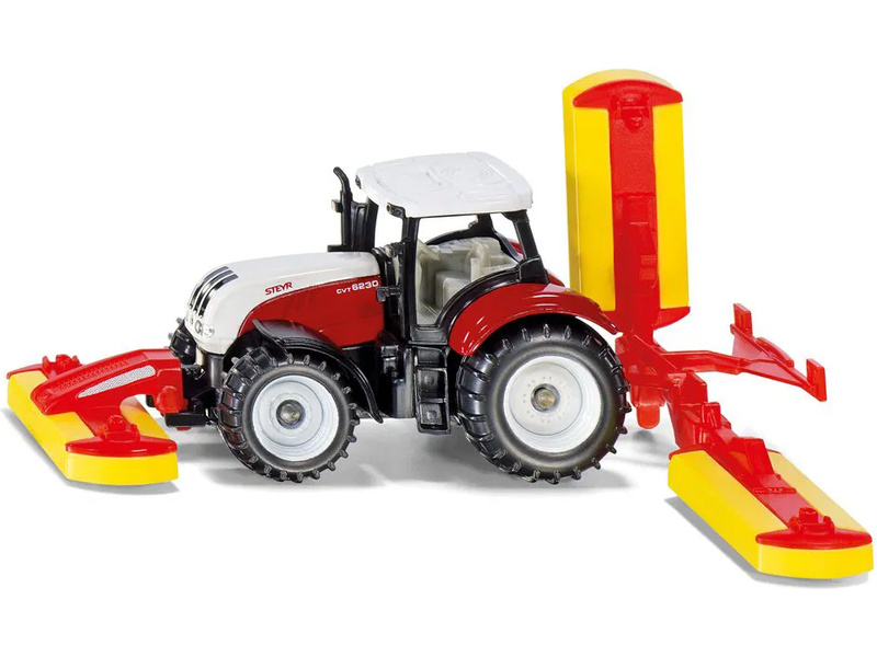 Kovový model traktoru Steyr s žacími lištami Pöttinger, délka přibližně 11 cm, měřítko 1:87. Traktor je vybaven tažným zařízením, odnímatelnou střechou, přední a zadní odnímatelnou žací lištou. Zadní ramena jsou sklopná pro jízdu po silnici, jako u skutečného traktoru. Vhodné pro hraní i sběratelství. Kvalitní zpracování z kovu a plastu. Baleno v blistru.