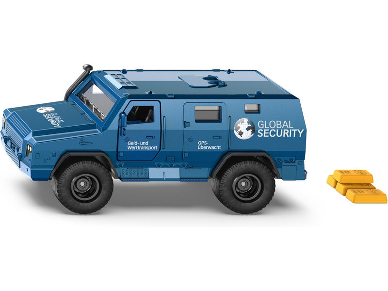 Kovový model auta pro přepravu peněz a cenností v měřítku 1:50 v modré metalické barvě. Otevírací boční a zadní dveře. Včetně maket zlatých cihel a archů se samolepkami a kartiček z kartonu. Vhodné pro hraní i sběratelství. Kvalitní zpracování z kovu a plastu.