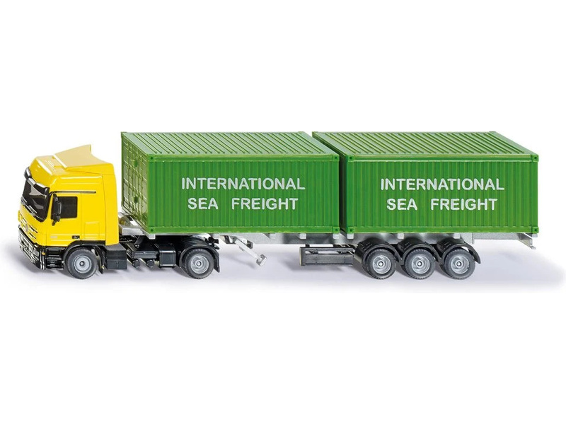 Kovový model kamionu se 2 kontejnery v měřítku 1:50. Model obsahuje třínápravový návěs se dvě kontejnery s otevíracími dveřmi a sklopnou stojku. Zadní část návěsu lze zasunout pro přepravu jen jednoho kontejneru. Vhodné pro hraní i sběratelství. Kvalitní zpracování z kovu a plastu.