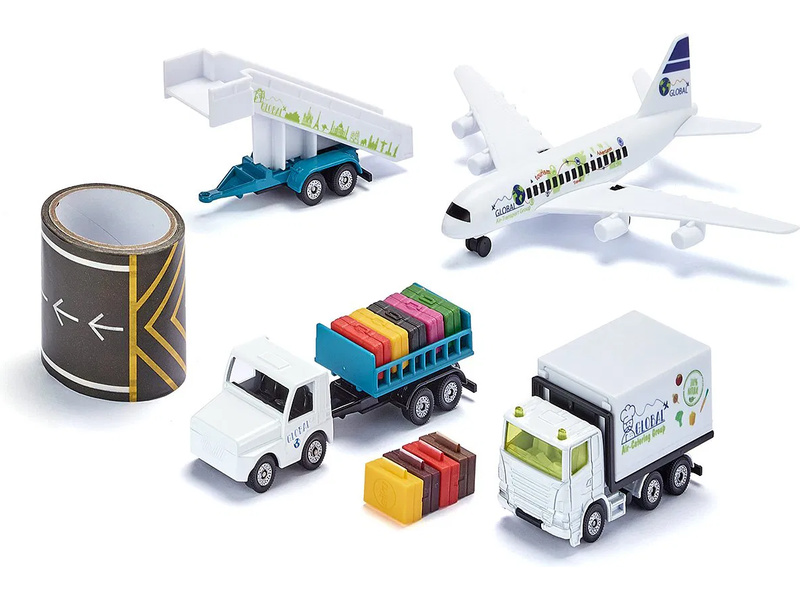 Sada kovových modelů - letištní odbavovací set od značky Siku. Sada obsahuje letadlo s koly, cateringový vůz, letištní vozidlo, za které lze připojit přívěs s otevíracími kufry nebo přívěs se schody. Součástí je páska s motivem dráhy o délce 5 m. Vhodné pro hraní i sběratelství. Kvalitní zpracování z kovu a plastu.