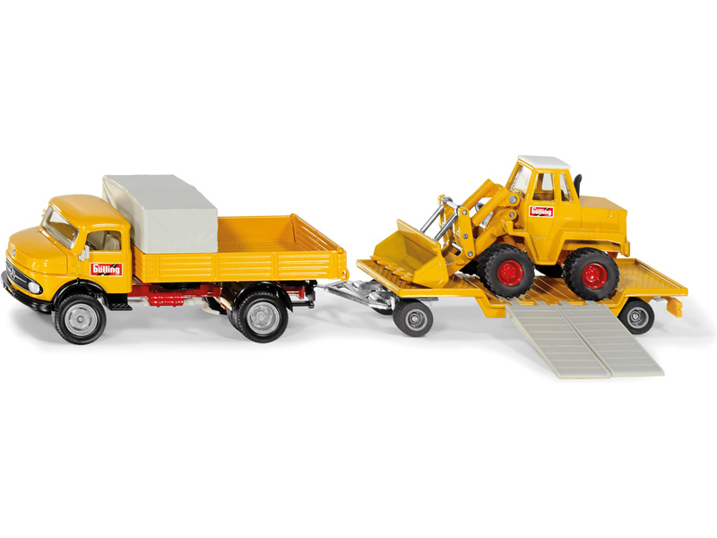 Kovový model auta Mercedes-Benz 710 s vlečkou převážející nakladač 411 Bölling v měřítku 1:50. Model má vyklápěcí korbu s funkčním čelem a otevírací kapotu. Návěs je s nájezdovou rampu. Nakladač má pohyblivé rameno se lžící. Vhodné pro hraní i sběratelství. Kvalitní zpracování.