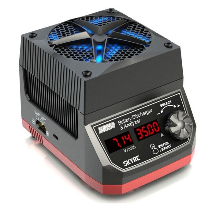 Inteligentní vybíječ s výkonem 250W pro vybíjení akumulátorů s napětím 5,4-35,0 V proudem 0,01-35,0 A. Nastavitelné koncové napětí pro vybíjení a vybíjecí proud, měří a zobrazuje okamžité napětí, proud a proteklý náboj. Nucené chlazení výkonným ventilátorem.