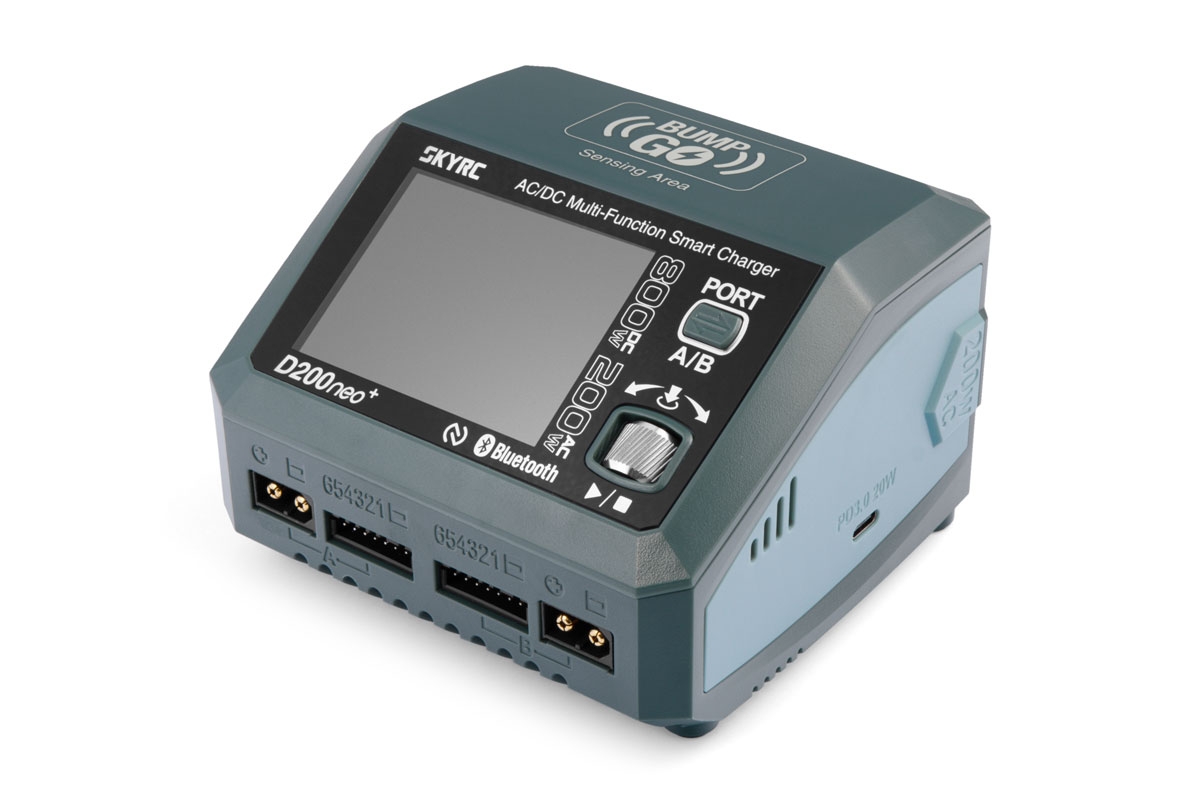 Dvoukanálový nabíječ SKY RC D200neo+ 800W byl konstruován se snahou poskytnout vše potřebné pro nabíjení dvou akumulátorů velkými proudy současně „pod jednou střechou" včetně síťového zdroje, s jednoduchou obsluhou a možností komunikace s aplikací SkyCharger. D200neo+ umožňuje nabíjet a vybíjet běžné typy článků (NiCd, NiMH, Li-poly, Li-ion, Li-Fe, Li-HV, Pb), navíc jsou oba kanály vybaveny vestavěnými šestikanálovými balancery, které zajišťují velmi bezpečné a komfortní nabíjení lithiových akumulátorů. Může také pracovat v režimu paralelního nabíjení, kdy oba kanály nabíjejí jeden akumulátor proudem 20-35 A. Při připojení externího vybíječe BD350 potom umožňuje vybíjení proudem až 40 A při max výkonu 350 W.