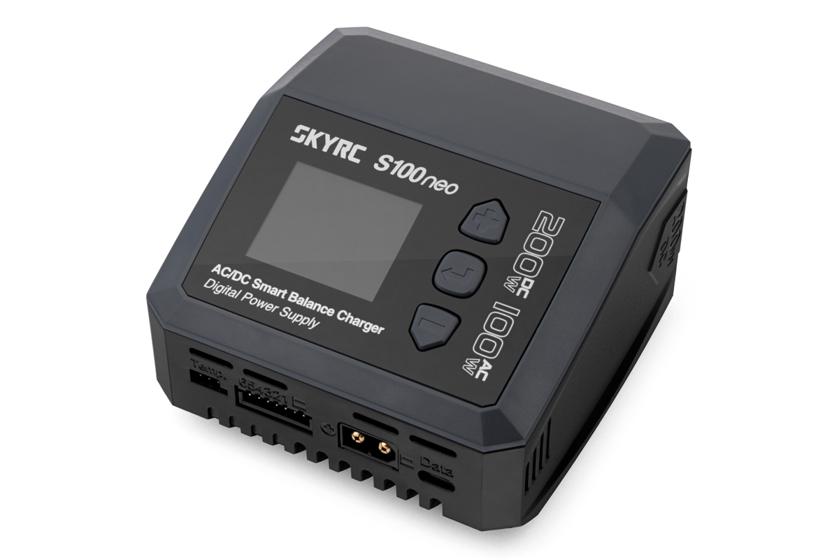 Malý nabíječ SKY RC S100neo 200W byl konstruován se snahou poskytnout vše potřebné pro nabíjení včetně výkonného síťového zdroje, s jednoduchou obsluhou. S100neo umožňuje nabíjet a vybíjet běžné typy článků (NiCd, NiMH, Li-poly, Li-ion, Li-Fe, Li-HV, Pb), navíc je vybaven vestavěným výkonným šestikanálovým balancerem (1 A/článek), který zajišťuje velmi bezpečné a komfortní nabíjení lithiových akumulátorů. Může také pracovat v režimu regulovaného napájecího zdroje s výstupním napětím nastavitelným v rozmezí 2–30 V a proudovým omezením 0,1–12 A.