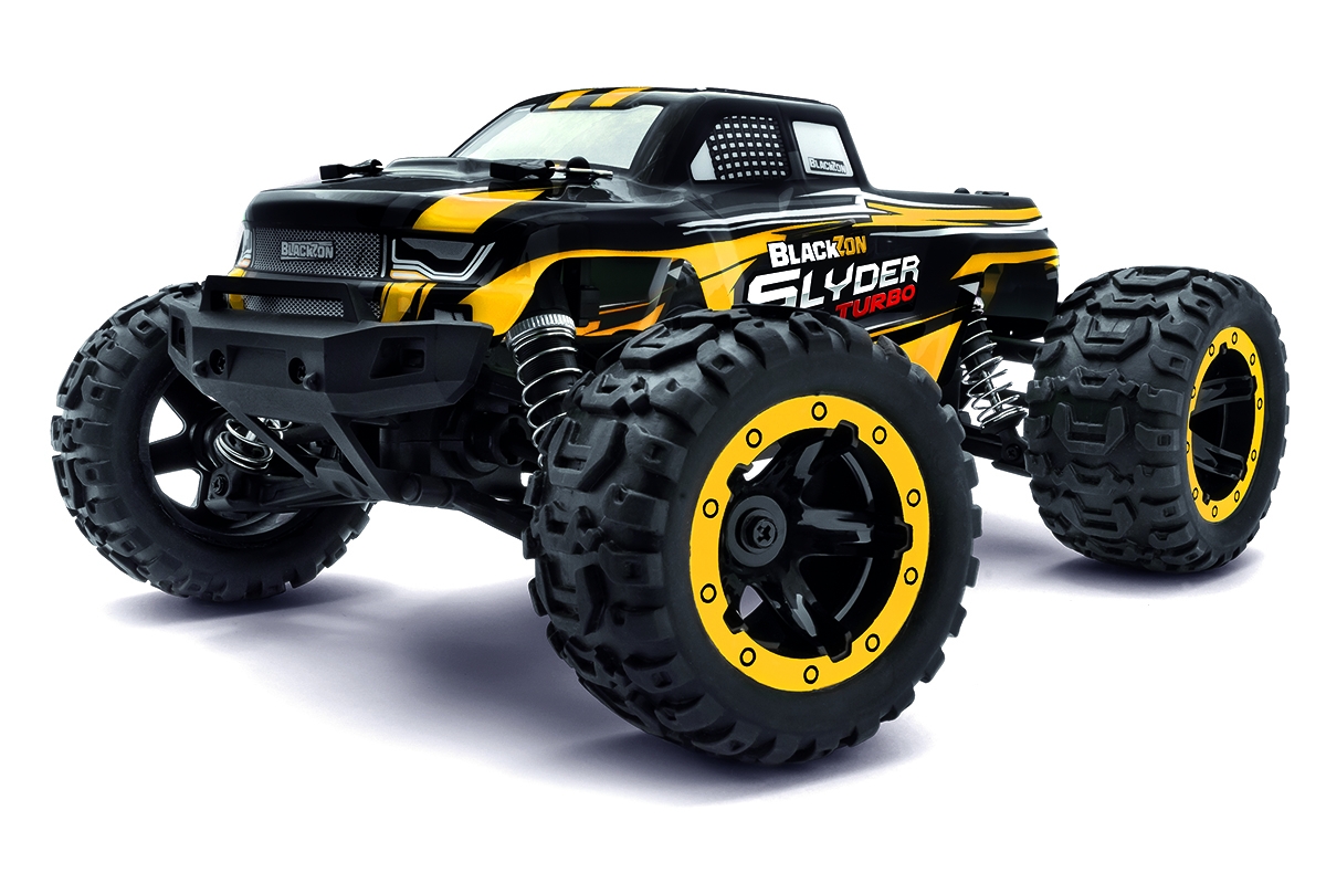Šestnáctinový RC monster truck je sice malý rozměry, ale velký možnostmi. Tento vůz s pohonem všech 4 kol je připraven čelit skokům a nárazům, a nezaostává ani při nejrůznější akrobacii. Díky 4x4 pohonu, rovnoběžníkovému zavěšení a stavitelným tlumičům zdolá nástrahy každého terénu, a díky krytým převodům a voděodolné elektronice se nezalekne ani kaluží, bláta nebo prachu. Nejen že v zelenočerném kabátku vypadá úžasně, ale doplněn o LED světlomety, je Slyder připraven i k jízdě za zhoršených světelných podmínek nebo v noci. LED světla jsou přibalena k modelu, a podle preferencí jezdce je lze umístit kamkoliv, a poté pouze připojit konektor k akumulátoru.Verze Turbo navíc oproti základnímu Slyderu obsahuje střídavý motor velikosti 390, se kterým model stiskem plynu doslova vyletí vpřed. Aby ho mohl řídit úplně každý, je na jeho vysílači umístěn volič rychlosti, kterým lze nastavit pomalejší tempo pro potřeby začátečníků. Dostanete zde navíc silnější 7.4V 1000mAh LiPo akumulátor, který lze nabíjet přibaleným USB nabíječem pro pohodlnější obsluhu. Celý set je navíc zabalen jako RTR (Ready To Ride), tudíž stačí pouze zapojit akumulátor, vložit do vysílače baterie, a vyrazit do terénu!