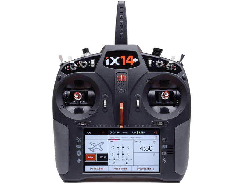Nejnovější v řadě inteligentních vysílačů Spektrum™ iX je 20-kanálový iX14+, který nabízí řadu výkonných funkcí pro středně pokročilé i náročné piloty, kteří vyžadují pokročilou programovatelnost a schopnosti létat s vysoce výkonnými RC modely letadel. Nabízí 20 kanálů a zahrnuje řadu nejnovějších vylepšení Spektrum v oblasti konektivity, programovatelnosti a ergonomie. Díky rychlému rozhraní Android, kompatibilitě Smart Technology, přesným křížovým ovladačům s Hallovými senzory pokračuje iX14+ v inovacích a posiluje její pozici na špici leteckých RC technologií. Vysílač navíc nově obsahuje programování (Forward Programming) pro nejnovější stabilizaci AS3X+, logické přepínače (možnost přiřazení podmínek k přepínači) a zbrusu novou funkci STF stažení nastavení modelu z přijímače (Smart Transmitter File Download), která uživateli poskytne snadný a jednoduchý způsob, jak získat nastavení modelu vysílače pro svůj model BNF, aniž by bylo potřeba jej hledat a stahovat.