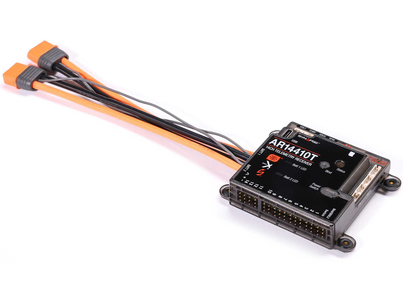 Převratnou funkcí přijímače AR14410T PowerSafe jsou vestavěné senzory, které zaznamenávají spotřebovanou kapacitou akumulátorů Smart. Přijímač má porty pro otáčky, napětí letových baterií a senzory teploty a také port X-Bus pro další externí telemetrie. Snadnou aktualizaci zaručuje USB-C port.