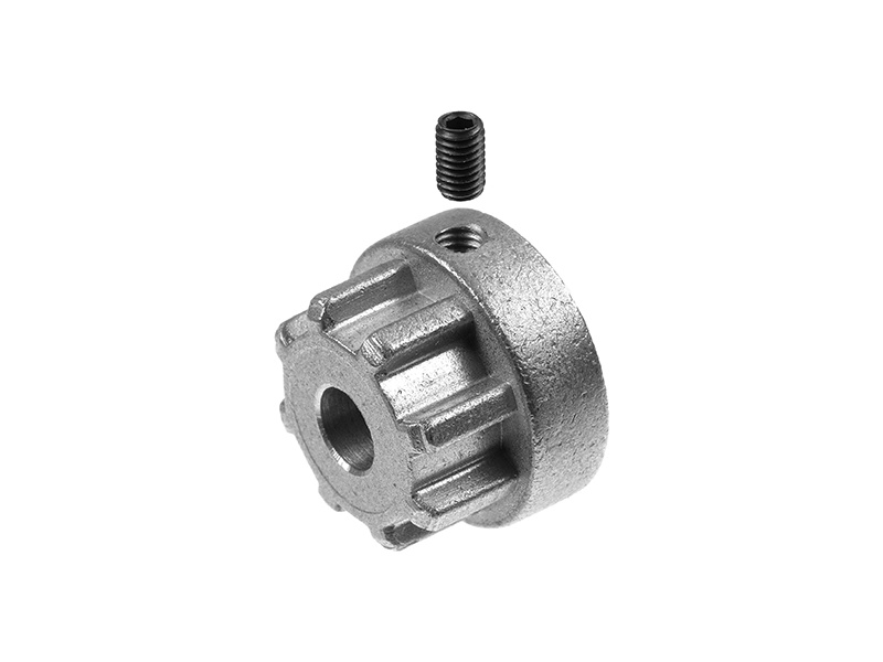 Spojka hřídelí adaptér Flex kovový, průměr 18mm, délka 12mm, vnější průměr ozubení 15,4mm, vnitřní 11,8mm, otvor 5mm, pojištění červíkem M3. Pro pružnou Spojku hřídelí Flex 18 .