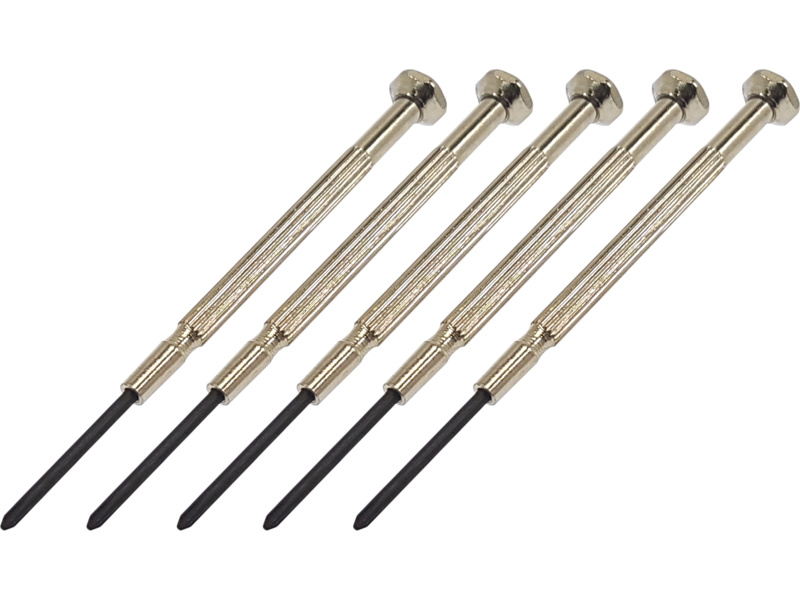 Šroubovák hodinářský křížový PH0 (5ks) je určený pro jemné mechanické práce, drobné šrouby v elektronice, hodinách, brýlích, RC modelech a v jiných aplikacích. Kovová vroubkovaná rukojeť s otočným koncem.