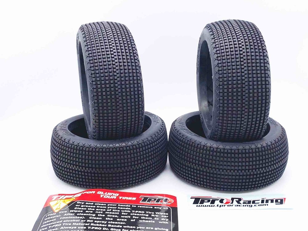 Naše pneumatiky TPRO jsou k dispozici ve 2 různých typech. Jednak jako nelepené pneumatiky v sadě po 4 kusech, nebo jako hotové lepené pneumatiky v páru po 2 kusech. U lepených kol se používá naše modrá vložka TPRO ve střední barvě (TP1309I3) a bílé disky v měkké verzi (TP100011SWH).