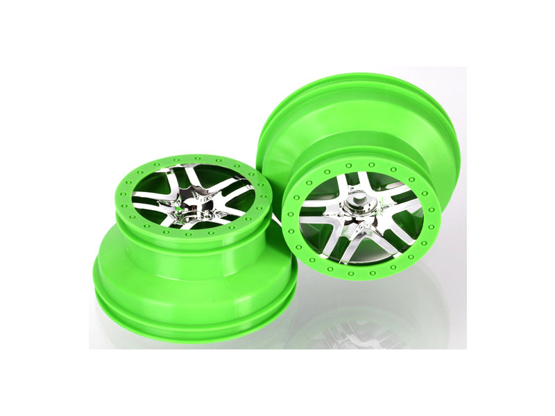 Disky kol 2WD zadní, 4WD přední/zadní SCT Split Spoke chromově lesklé se zeleným ráfkem. Průměr disku 56/76 mm (2.2/3.0"), šířka 41 mm. Pro auta Traxxas Slayer 3.3. Šestihran 12 mm.