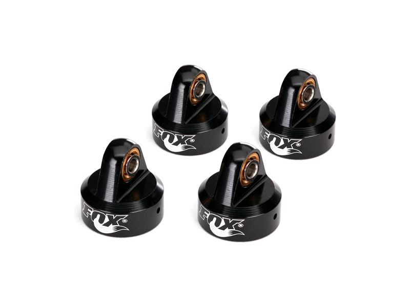 Hlava tlumiče Traxxas, hliníková černá s motivem FOX, 4ks. Tuningový díl pro Unlimited Desert Racer.