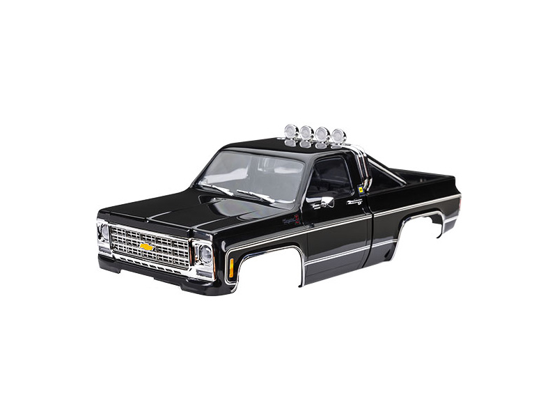 Traxxas karosérie Chevrolet K10 1979 černá, pro RC model auta TRX-4M s delším rozvorem 162 mm (High Trail). Bez-sponková karoserie v měřítku 1:18 z ABS, kompletní, včetně čirých oken, přední mřížky, bočních zrcátek klik dveří a další. Vyžaduje přední a zadní nárazník TRA9835.
