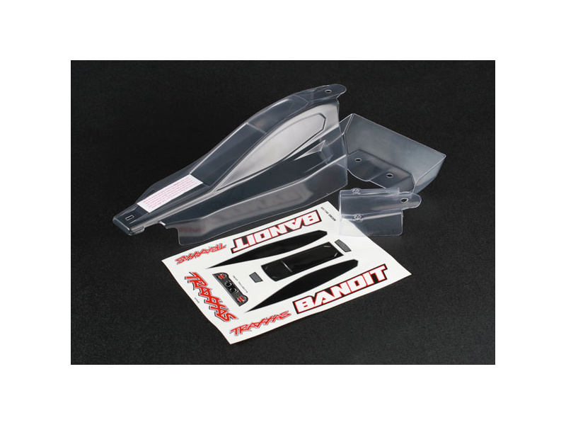 Nenabarvená lexanová karosérie pro RC model auta Traxxas Bandit. Přední a zadní část je oddělená. Balení dále obsahuje arch samolepek.