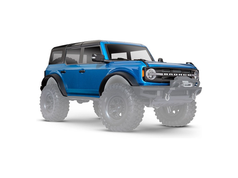 Traxxas karosérie Ford Bronco 2021 modrá - kompletní nabarvená. Určeno pro RC model Traxxas TRX-4 Ford Bronco 2021 nebo jiné modely TRX-4 s rozvorem 324 mm / konverzní sadou a s instalovanými blatníky pro bez-sponkové upínaní karoserie.
