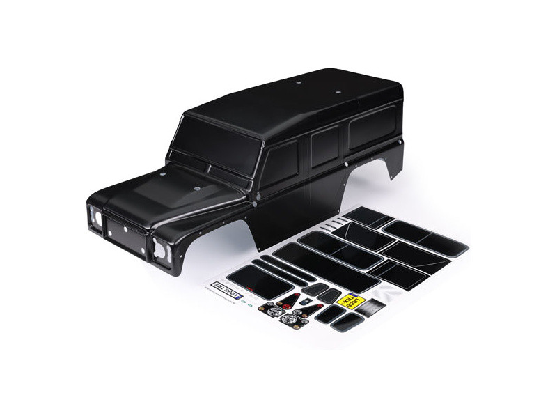 Náhradní díl pro RC modely aut Traxxas na podvozku TRX4: karosérie Land Rover Defender černá s obtisky. Pro rozvor náprav 324mm.