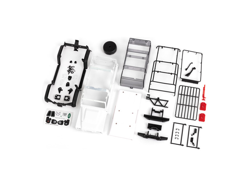 Traxxas karosérie Land Rover Defender nenabarvená bílá, kompletní (nesestavená), pro RC model auta TRX-4M. Bez-sponková karoserie v měřítku 1:18 z ABS, včetně čirých oken, makety rezervního kola, kanystrů, heveru, lemů blatníků, bočních zrcátek a dalších detailů.