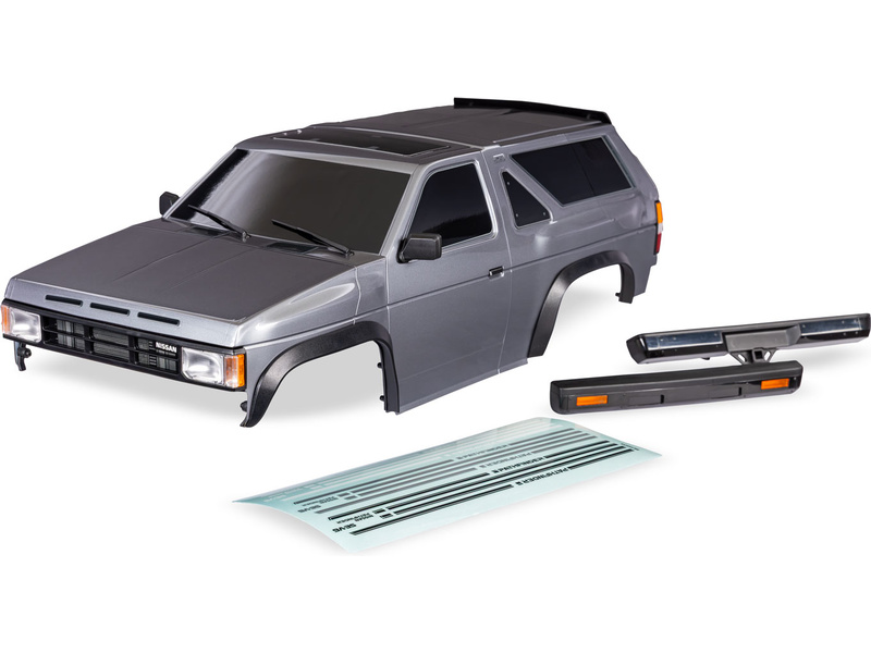 Traxxas karosérie TRX-4 Nissan Pathfinder 1988 stříbrná (bezsponková). Kompletní, nabarvená. Včetně masky chladiče, zrcátek, klik dveří, stěrčů a předního a zadního nárazníku. Rozvor 312 mm. Určeno pro montáž na blatníky TRA8080X.