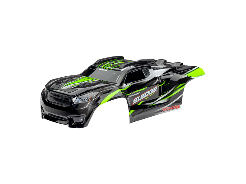 Nabarvená karosérie pro RC model auta Traxxas Sledge - zelená. Karoserie je kompletní včetně, rámu karoserie.