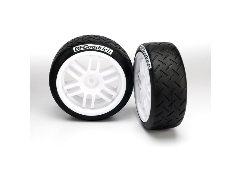 Kompletní univerzální kola pro RC auta Traxxas Rally 1:16. Bílý disk s nalepenými pneumatikami BFGoodrich® Rally.