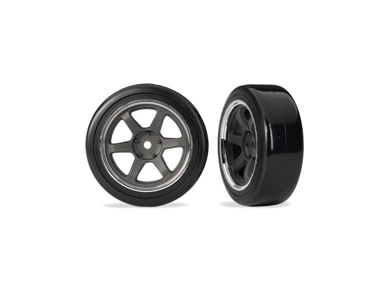 Náhradní díl pro RC modely aut Traxxas 4-Tec Drift Ford Mustang 1:10 RTR: kolo 1.9", grafitově šedý disk, pneu drift tvrdá přední (2 ks)