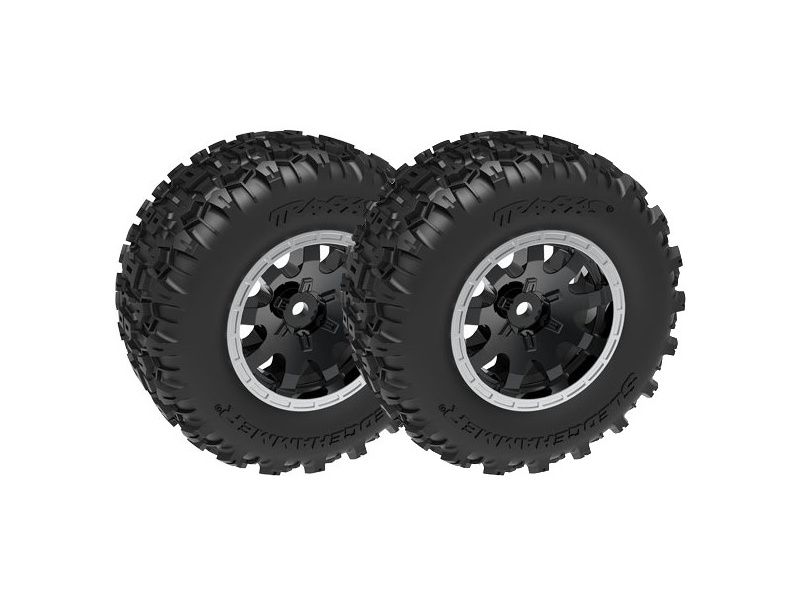 Kompletní zadní kola pro RC auto Traxxas Mini Maxx. Disk černý saténový s pneumatikami Sledgehammer s pěnovou vložkou. Průměr disku 2.1" (vnější) /2.6" (vnitřní).