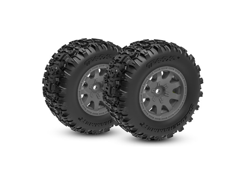 Kompletní přední kola pro RC auto Traxxas Mini Maxx. Disk šedý s pneumatikami Sledgehammer s pěnovou vložkou. Průměr disku 2.1" (vnější) /2.6" (vnitřní).