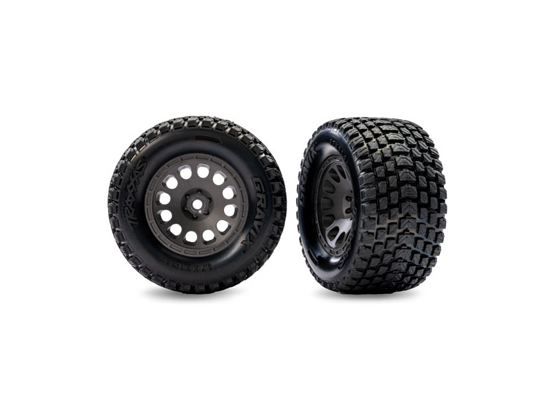 Kompletní přední kola pro RC auto Traxxas Mini XRT. Disk uhlově šedý s pneumatikami Gravix s pěnovou vložkou. Průměr disku 2.1" (vnější) /2.6" (vnitřní).