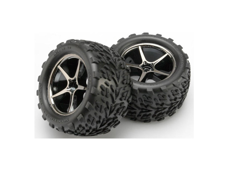 Kompletní univerzální kola pro auta Traxxas Revo 1:16. Disk Gemini v barvě černý chrom s nalepenými pneumatikami Talon a vložkou.