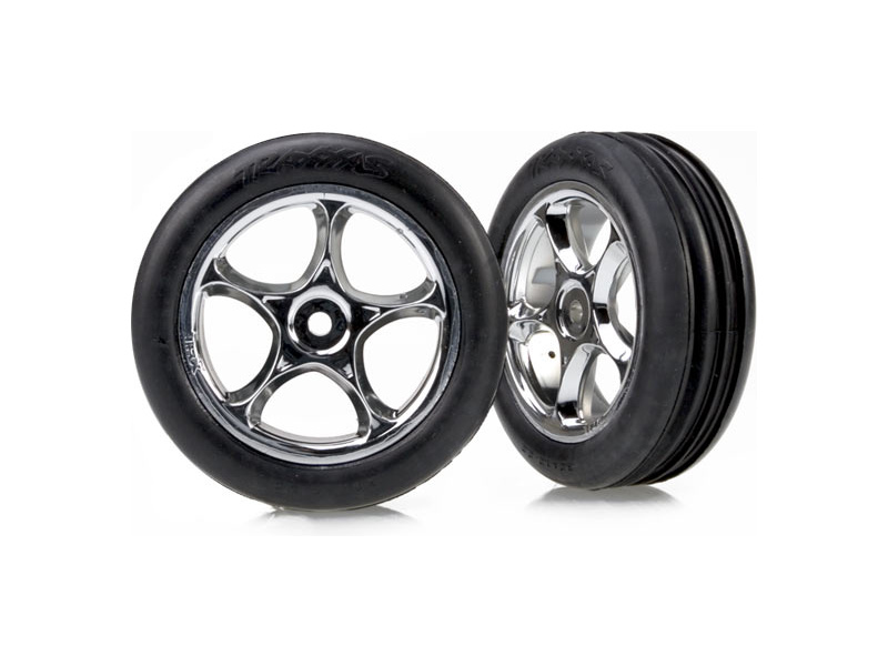 Kompletní přední kola pro auta Traxxas Bandit. Chromované disky s pneumatikami Ribbed. Tvrdost směsi pneumatiky je měkká.