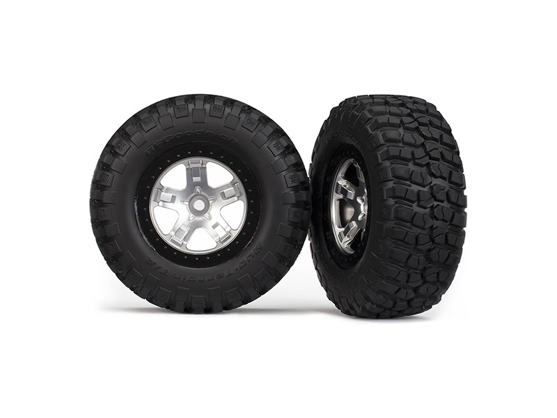 Kompletní přední kola pro 2WD, přední i zadní kola pro 4WD auta Traxxas Slash. Stříbrné disky s černými ráfky nalepenými pneumatikami BFGoodrich® KM2 a vložkou.