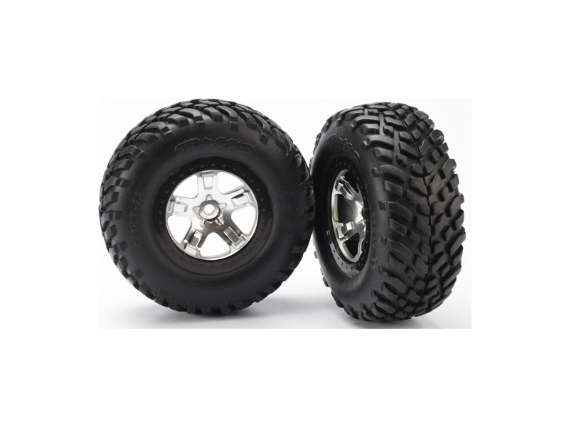 Kompletní zadní kola pro 2WD, přední i zadní pro 4WD auta Traxxas Slash. Stříbrné disky s černými ráfky a nalepenými pneumatikami Off-Road s vložkou