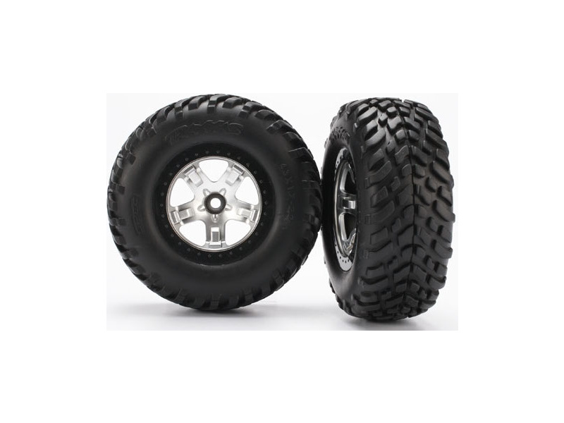 Kompletní přední kola pro 2WD auta Traxxas Slash. Stříbrné disky s černými ráfky a nalepenými pneumatikami Off-Road s vložkou. Rozměr disku 61/81x42 mm.