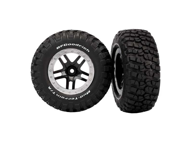 Kompletní zadní kola pro 2WD, přední i zadní kola pro 4WD RC auta Traxxas Slash. Disky Split Spoke černé se stříbrnými ráfky, nalepené pneumatiky Goodrich KM2 Mud Terrain. Rozměr disku 61/81x42 mm. Celkový rozměr 110x46 mm. Unašeč je šestihran 12mm s offsetem 24 mm.
