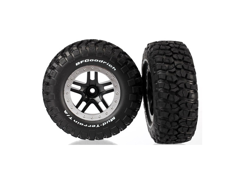 Kompletní přední kola pro 2WD pro RC auta Traxxas Slash. Disky Split Spoke černé se stříbrnými ráfky, nalepené pneumatiky Goodrich KM2 Mud Terrain.