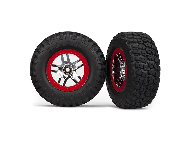 Kompletní přední kola pro 2WD auta Traxxas Slash. Stříbrné disky s červenými ráfky a nalepenými pneumatikami BFGoodrich® KM2 a vložkou.