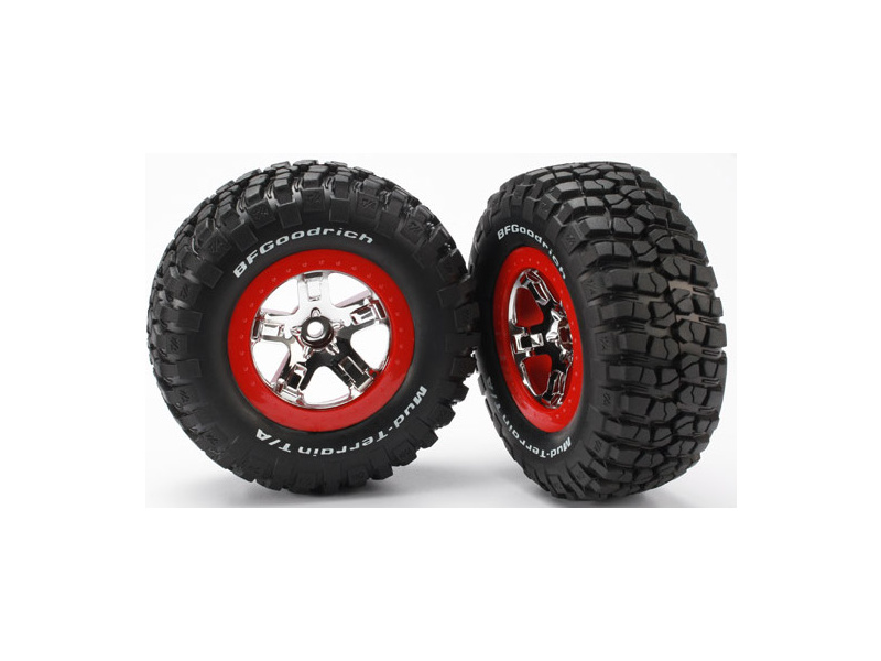 Kompletní přední kola pro 2WD auta Traxxas Slash. Chromované disky s červenými ráfky a nalepenými pneumatikami BFGoodrich® s vložkou