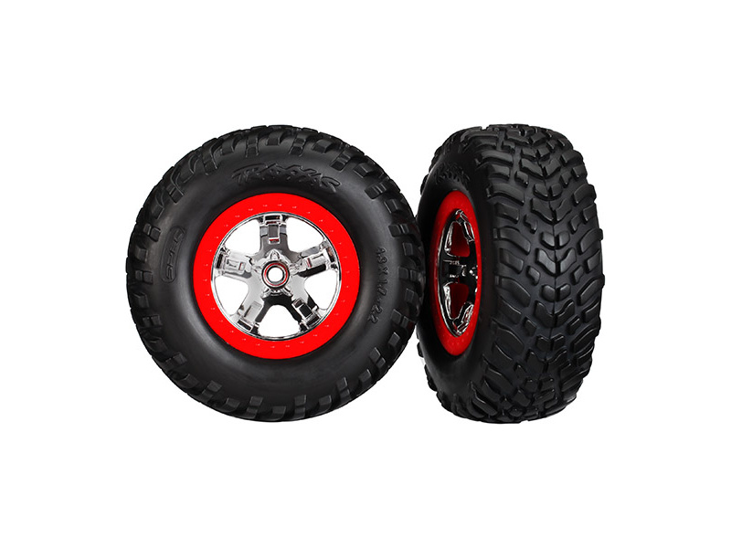 Kompletní zadní kola pro 2WD, přední i zadní pro 4WD auta Traxxas Slash. Chromované disky SCT s červenými ráfky s nalepenými pneumatikami SCT a vložkou.
