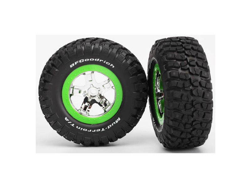 Kompletní přední kola pro RC auta. Chromované disky se zelenými ráfky a nalepenými pneumatikami BFGoodrich® s vložkou.