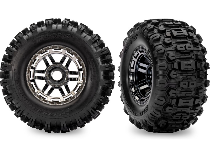 Traxxas kolo 2.8", disk černý chrom, Sledgehammer tires (2) - pneumatiky poskytují extrémní trakci a kontrolu nad modelem v různých off-roadových terénech. Nalepené pneumatiky s pěnovou vložkou na discích. Unášeč 17 mm.