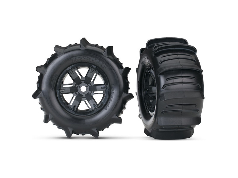 Kompletní kola pro model X-Maxx. Černé disky s lopatkovými pneumatikami (2 ks v balení). Paddle tires-lopatkové pneumatiky jsou vhodné do písku, sněhu nebo pro jízdu po vodní hladině.