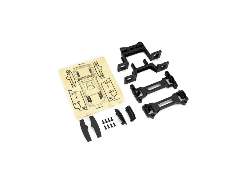 Konverzní sada bezsponkové karosérie Stampede 2WD, pro přestavbu vašeho RC modelu auta Traxxas Stampede 2WD 1:10 s klasickou karoserií (s klipy) na bezsponkový systém uchycení. Balení obsahuje přední a zadní držáky, západky karoserie, montážní příslušenství.